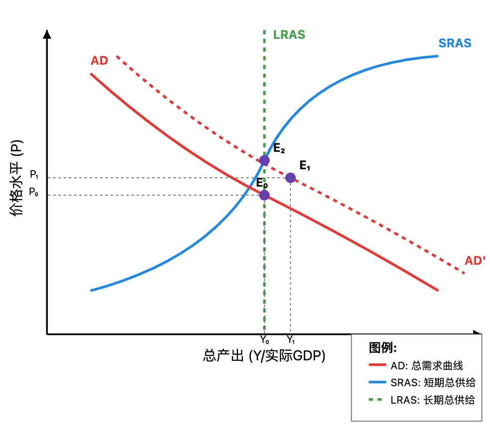 E₀:初始均衡点,AD与SRAS曲线的交点,决定了均衡价格水平P₀和均衡产出Y₀