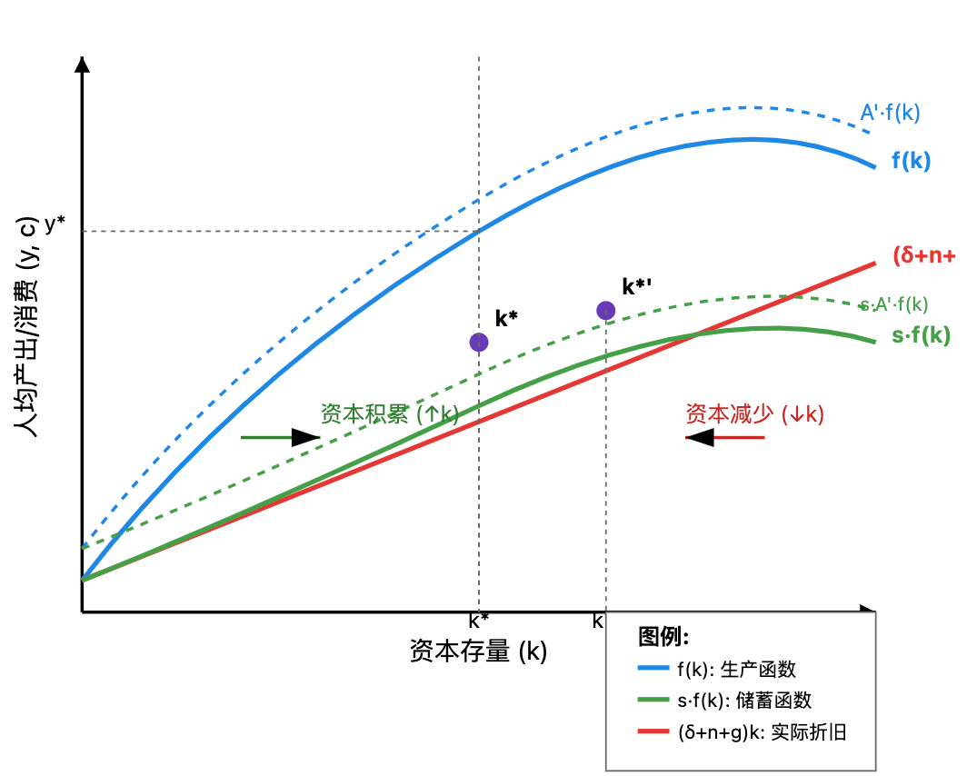技术进步的作用:可持续的长期经济增长主要依赖于技术进步(A的增长),图中表现为生产函数的整体上移。